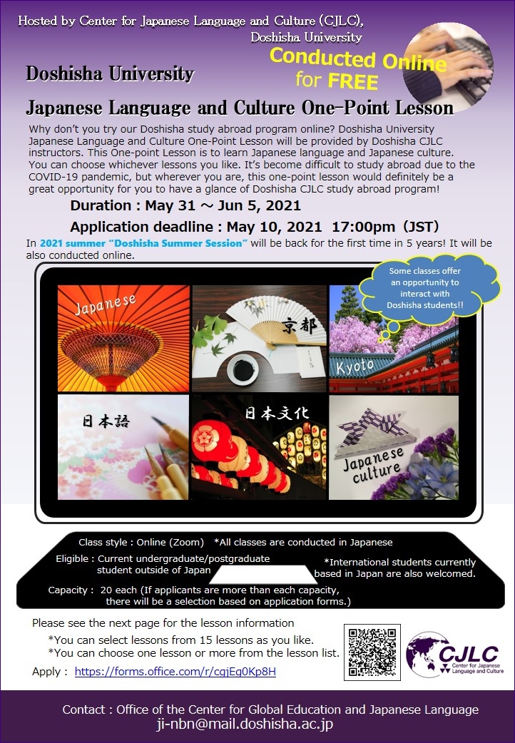 Why don’t you try our Doshisha study abroad program online? Doshisha University Japanese Language and Culture One-Point Lesson will be provided by Doshisha CJLC instructors. This One-point Lesson is to learn Japanese language and Japanese culture. You can choose whichever lessons you like. It’s become difficult to study abroad due to the COVID-19 pandemic, but wherever you are, this one-point lesson would definitely be a great opportunity for you to have a glance of Doshisha CJLC study abroad program!
