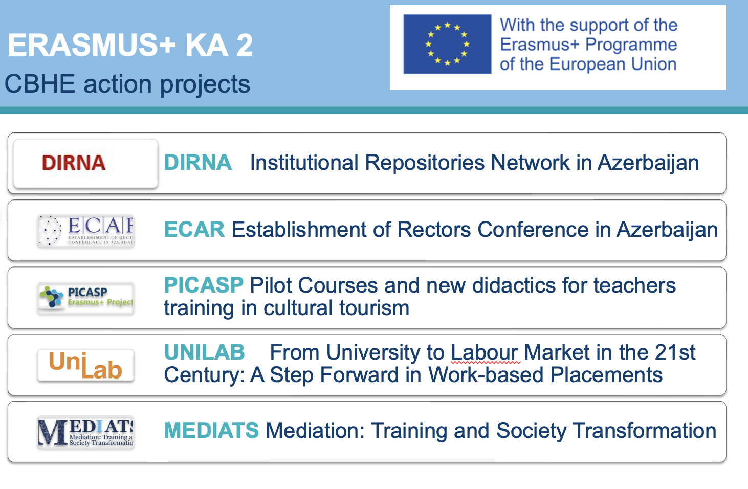 Currently Khazar University participates in capacity building and international credit mobility projects in cooperation with universities from Europe within Erasmus+ Programme.