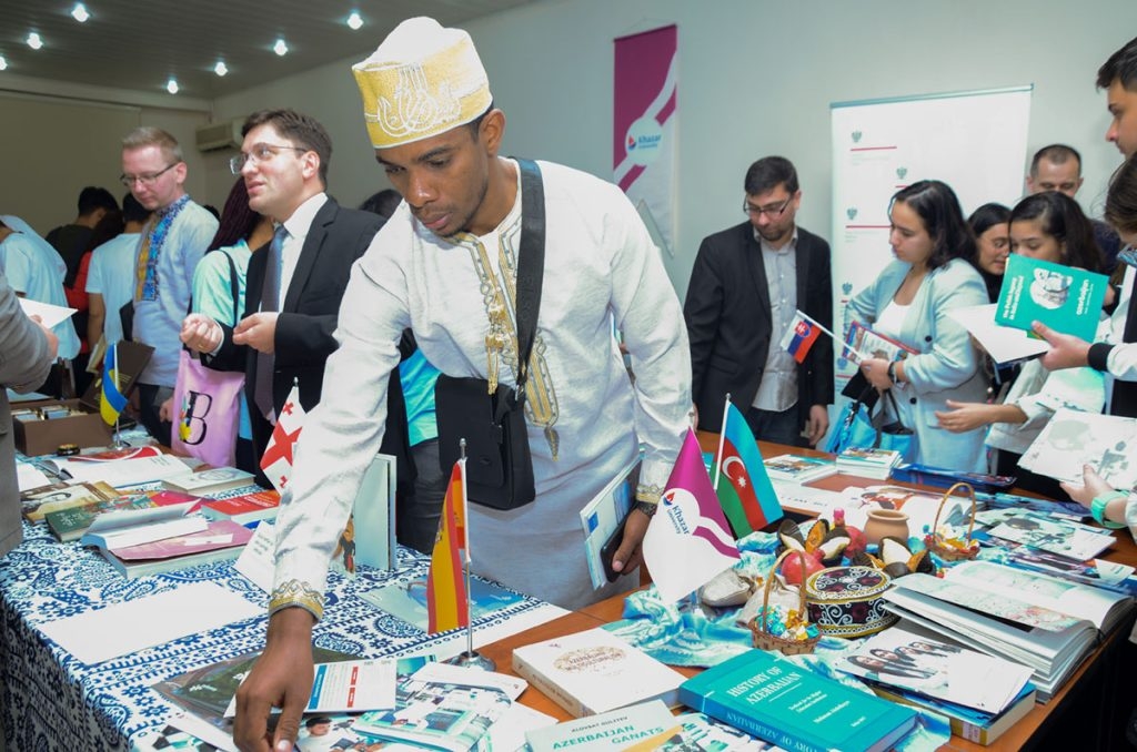 A short video of the European anthem was shown in different languages. Then interactive games were held by representatives of each country together with participants. Shayasta Malekan, Fatima Aliyeva and Ramala Hasanova, students of the Department of English Language and Literature of Khazar University, majoring in philology, made an interesting presentation on “Indo-European languages“. Participants of the event also viewed stands with symbols and booklets reflecting the traditions of different countries.