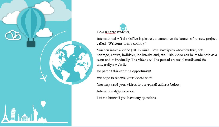 You can make a video (10-15 mins). You may speak about culture, arts, heritage, nature, holidays, landmarks and, etc. This video can be made both as a team and individually. The videos will be posted on social media and the university’s website.